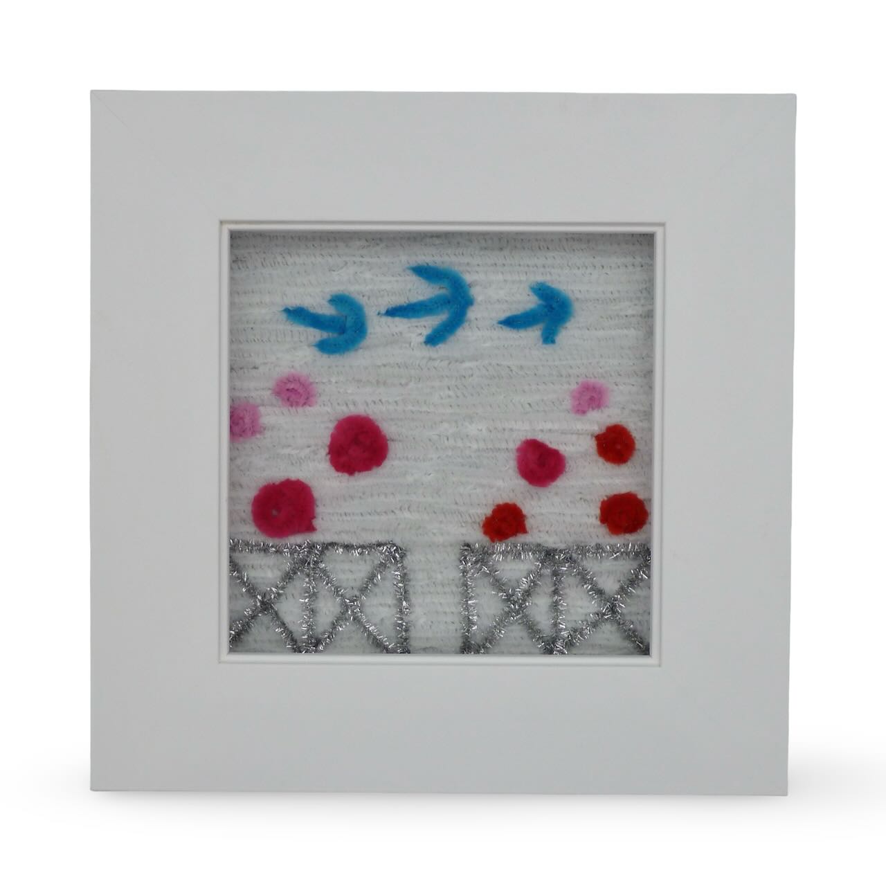The story - I wanted to make a surrealist garden. Light and airy, pops of color with a glittering fence to peek over.