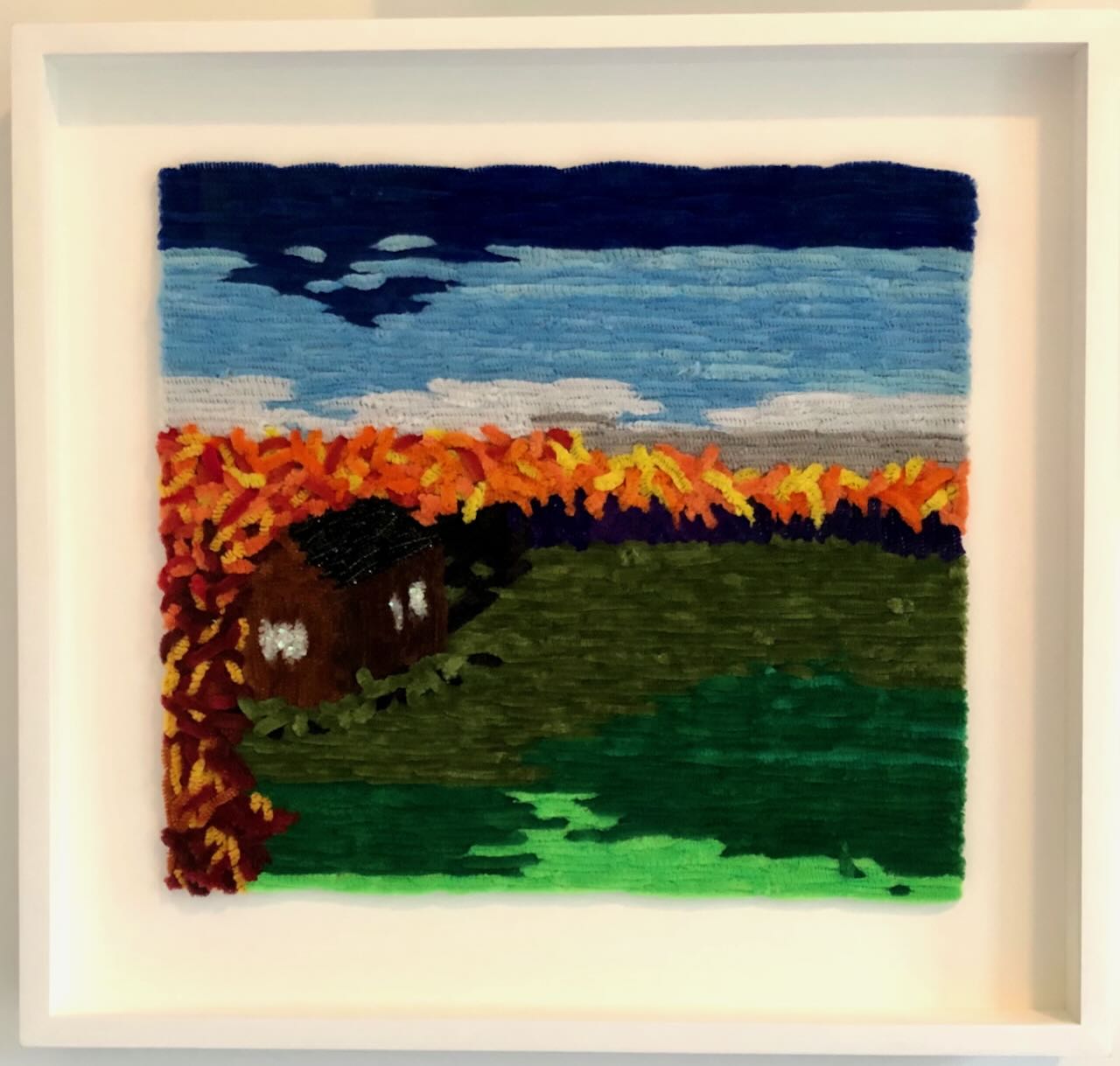 The story — Inspired by the view from my backyard in the fall, I added my dream studio to the scene. I was especially excited to use black tinsel pipe cleaners for the roof, catching the light like an early frost glittering.